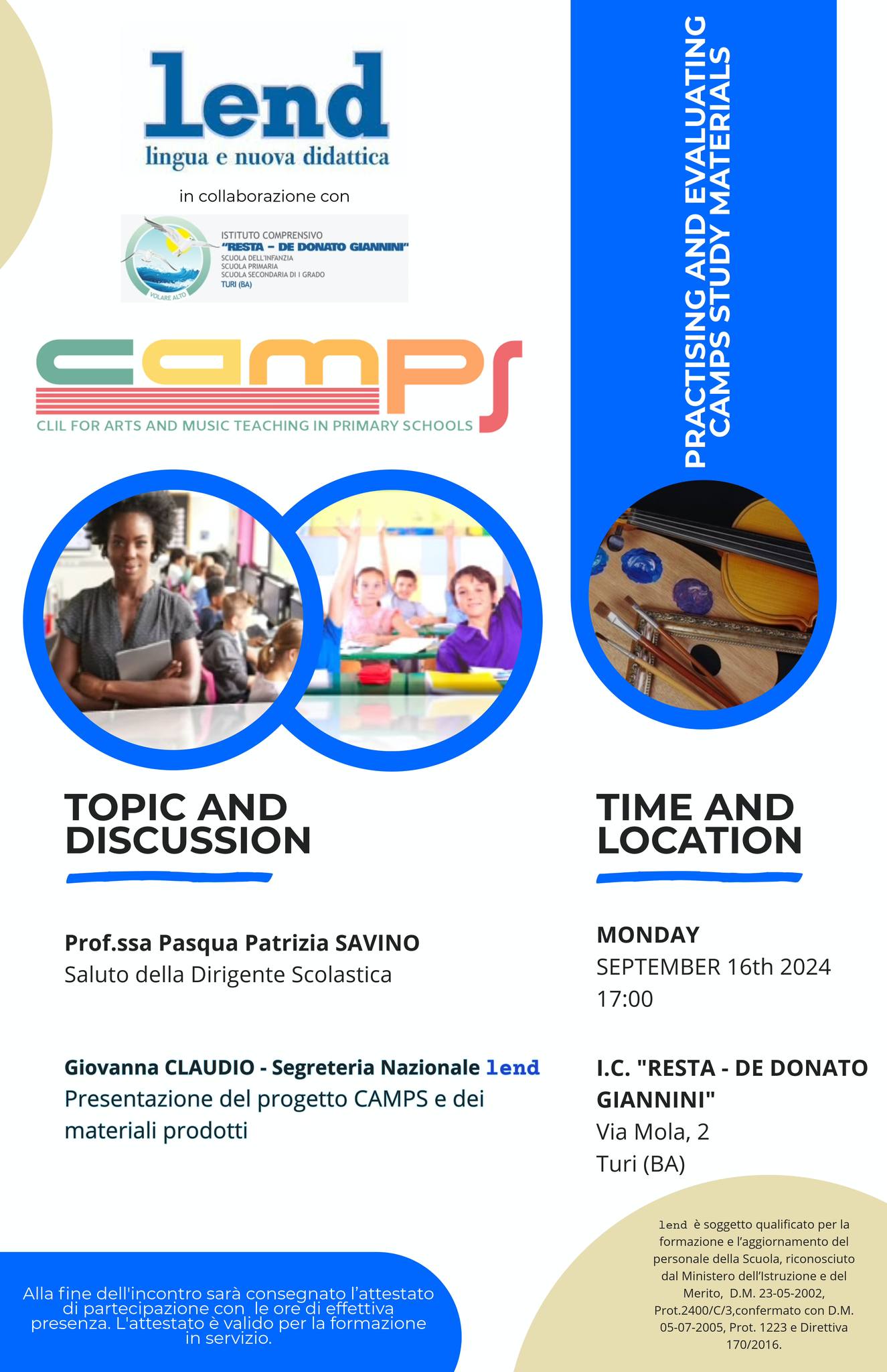 16/09/2024, Il gruppo Lend Bari ha organizzato un incontro di presentazione del progetto CAMPS e dei relativi materiali di studio, video didattici e proposte di attività per la classe per la scuola primaria.