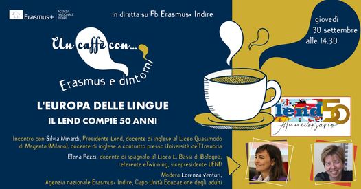 Festeggiate con noi i 50 anni del LEND e la bellezza delle lingue! Ecco le nostre ospiti di "Un Caffè con...", domani in diretta su questa pagina: Silvia Minardi ed Elena Pezzi, due docenti di lingua attive da sempre su Erasmusplus e eTwinning, rispettivamente Presidente e Vicepresidente del Lend. Facebook